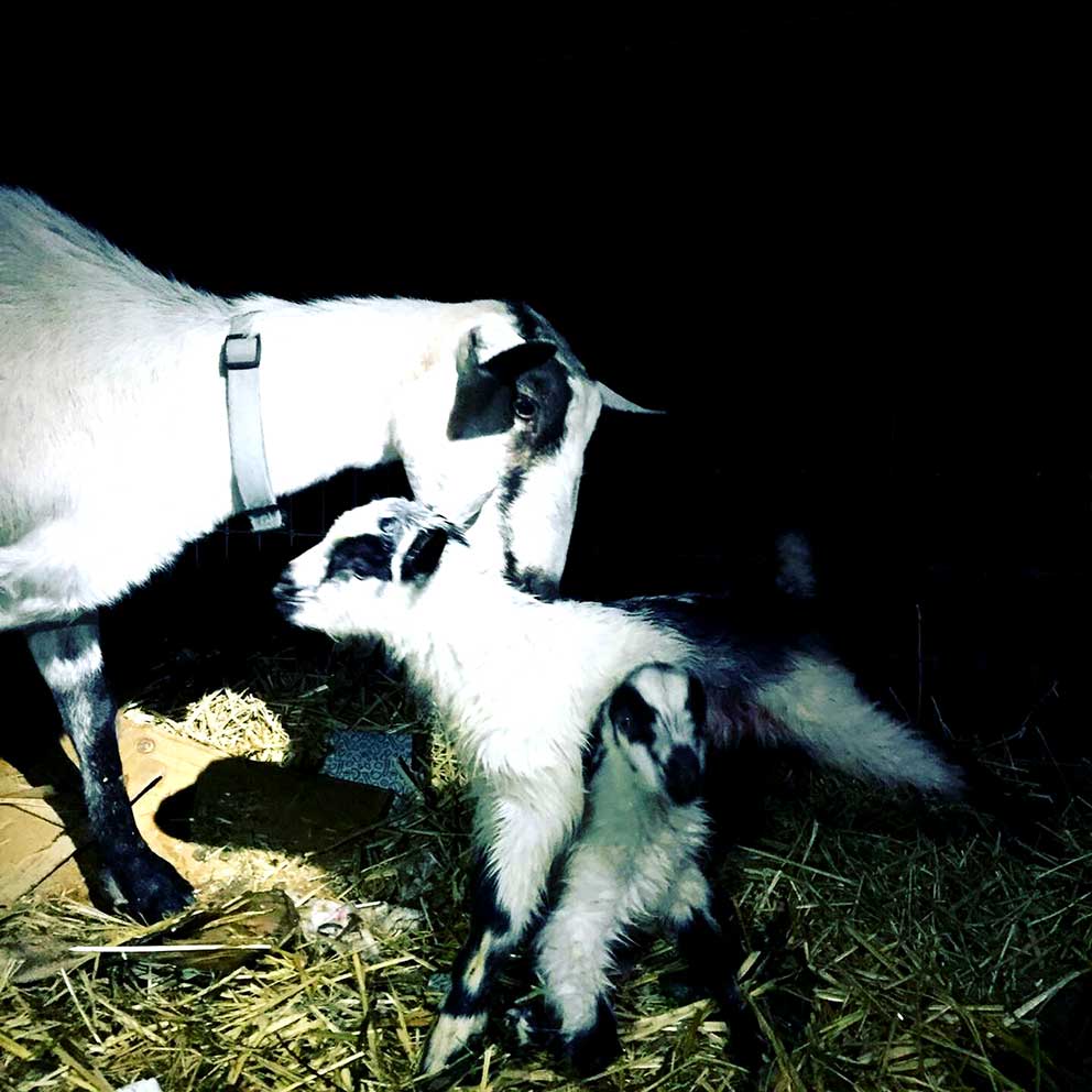 J’ai dans les mains une petite chose toute longue, légère et gluante. ll est noir et blanc, copie conforme du modèle Poppy et Dingle. Ce qui semble assez normal puisqu’elle est allée en Sexcation avec le même mâle que Poe (!) Je nettoie la bouche et le nez du chevreau et le rend à sa maman. On checke son sexe : c’est un mâle. J’ai l’impression qu’il apprend à marcher encore plus vite que les nôtres. Le lendemain, il gambade déjà dans le grand pré en pente avec sa maman ! Je reste une heure de plus pour voir si un autre va sortir. En général les chèvres ont des portées de 2 ou 3 petits, mais rien cette fois : ce ne sera qu’un seul. Je donne des palettes et de la paille à Tom pour qu’il construise en vitesse un abri pour la maman et le bébé.