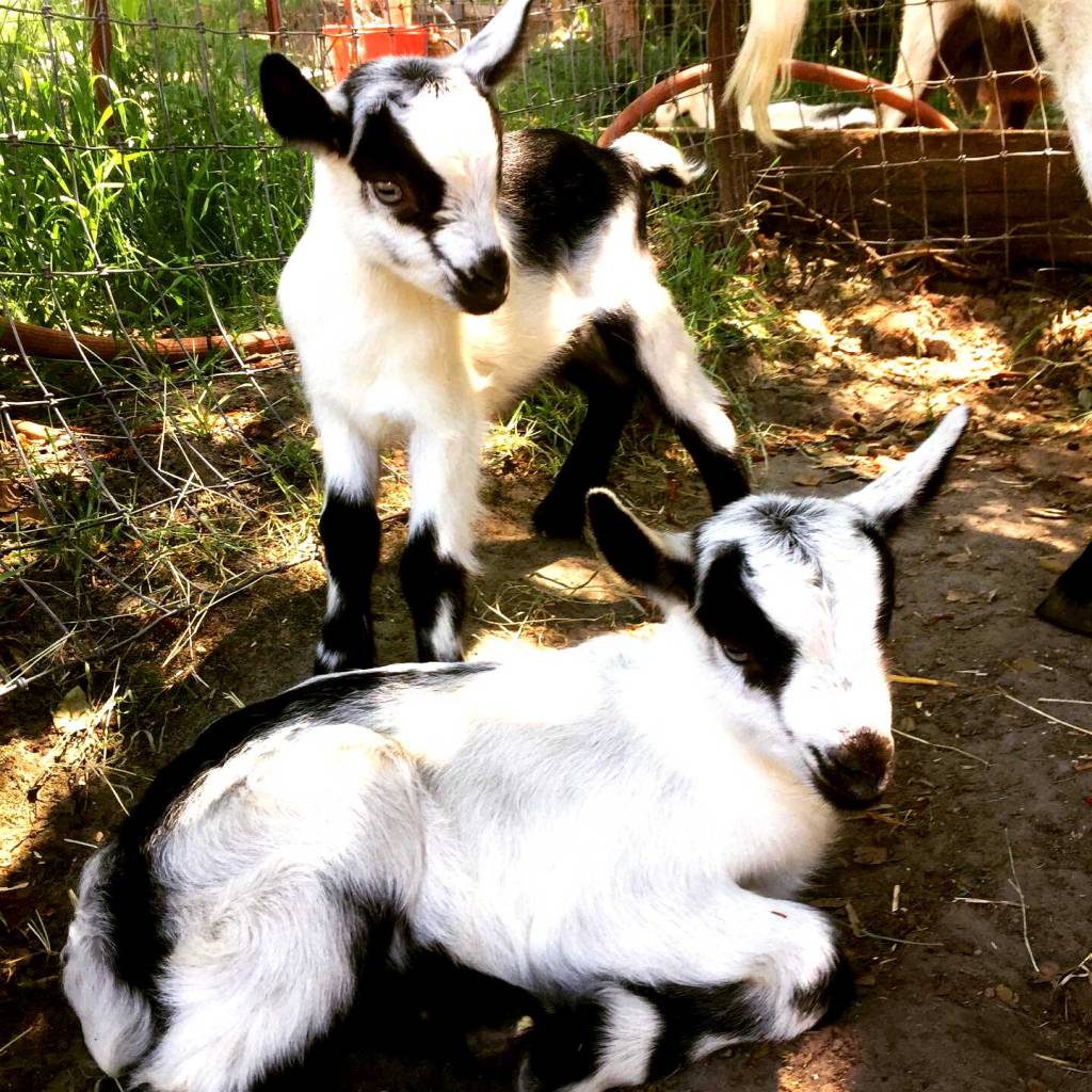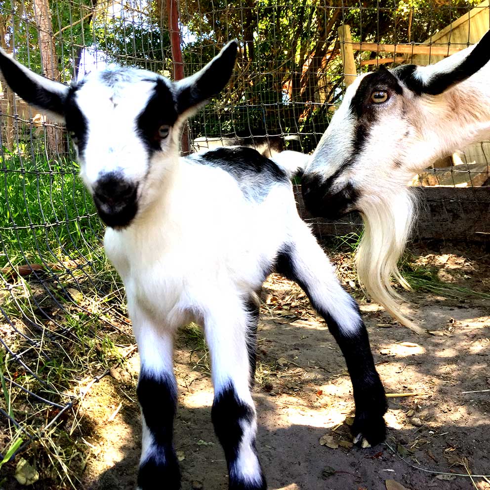 Quand ils ne dorment pas (car ils dorment beaucoup !), ils apprennent à sauter comme des petits cabris acrobates. Leur quatre pattes semblent montées sur ressort et leur corps suit tant bien que mal leurs mouvements désordonnés. C’est extrêmement amusant de les voir expérimenter leurs capacités de synchronisation, et je comprends soudain l’attrait des vidéos de bébés chèvres sur internet (!) On nomme les bébés Bonnie and Clyde. Avec leur tenue bicolore et leur air mi-angélique, mi-coquin ça leur va bien.