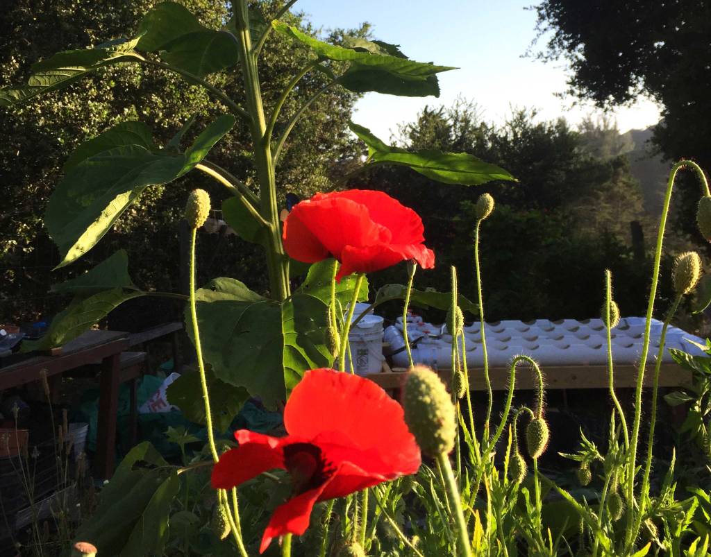 Il a fait très chaud (25-30°) et très sec de septembre à novembre (zéro pluie, même si l’on bénéficie du brouillard de l’océan le matin), l’été indien du jardinage ! Les premières pluie sont arrivées à Thanksgiving (fin novembre) et pour Noël (merci Santa pluie). On compte ici les jours de pluie sur les doigts d’une main… Anne-Sophie, la seule chèvre que nous trayons en ce moment, nous a donné ⅓ de jar chaque jour.
