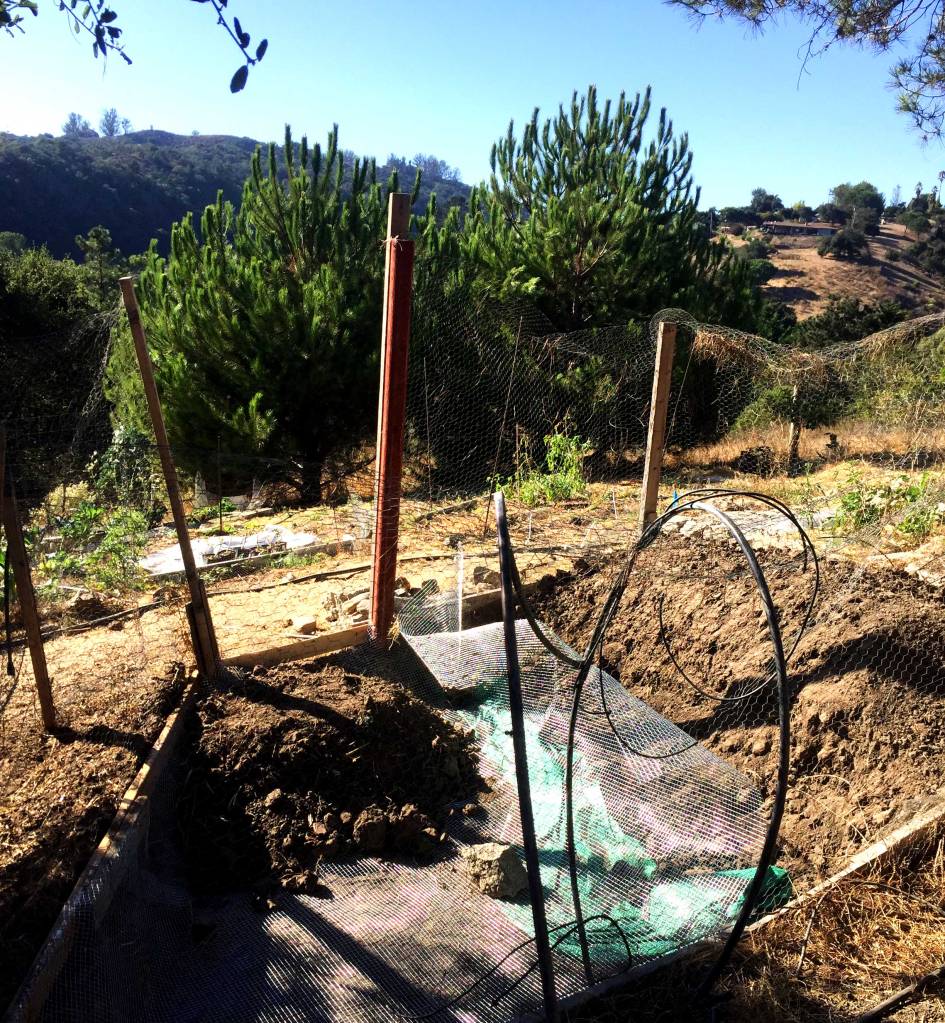Nous avons commencé à travailler en septembre. Nous ne partions pas de rien, il y a avait déjà quelques arbres fruitiers et quelques garden beds plantés de légumes. Nous avons sécurisé tous les garden beds existants en remplaçant le grillage en-dessous pour repousser les gophers (des sortes de petites taupes habiles et affamées). Nous avons construit 2 nouveaux garden beds en Hügelkultur (en enterrant des branches d’arbres sous le sol, on vous décrit le process en vidéo ici) et réalisé des lasagna beds (une façon de créer du sol riche en matière organique via un layering de différents matériaux qui vont se composter sur place). Nous avons planté un abricotier et un persimmon tree (kaki) dans le verger. Il a aussi fallu installer et régler tout le système d’irrigation automatique.