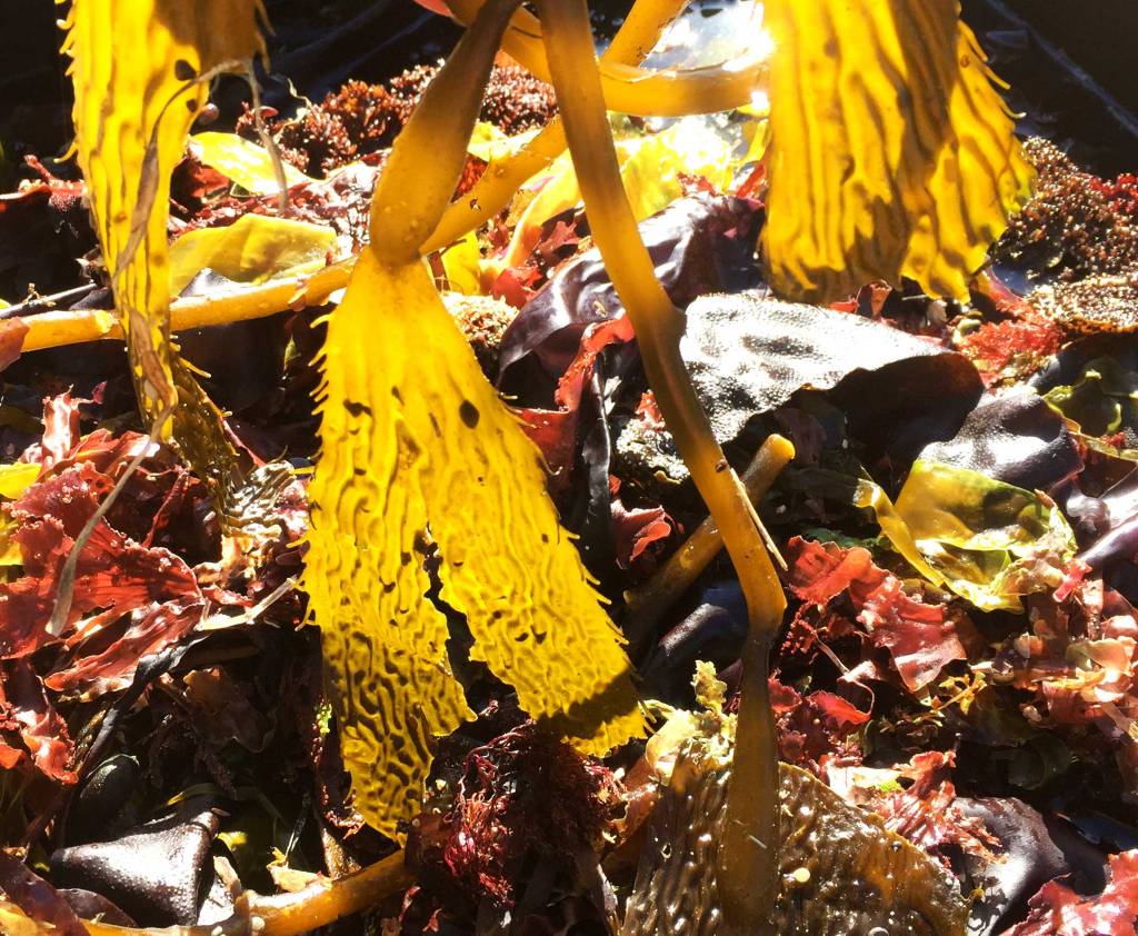 On aussi beaucoup aimé se servir des algues (que l’on récolte à l’océan qui est à côté). On les rince bien et les fait tremper dans des gros bacs d’eau pendant plusieurs jours. On utilise ensuite le « thé » obtenu dilué pour fertiliser les plantes. Une fois filtrées, les algues peuvent être simplement ajoutées à la pile de compost.