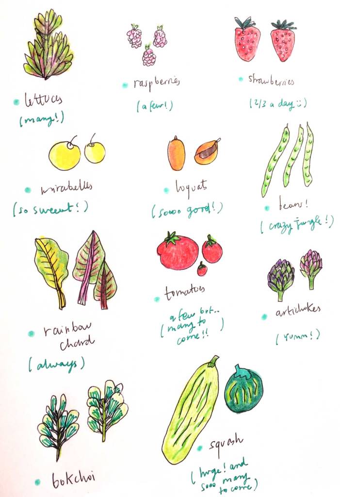 On a mangé des tomates (encore et encore et encore -et même des fermes de nos voisins car eux aussi en avaient cent fois trop), des courges, des tomatillos (ma découverte culinaire de l’année !), des bok choy, des poivrons, des salades, des artichauts, des haricots (frais et secs), des concombres, des épinards vivaces (New Zealand spinach). Côté fruits, c’est plus dur, mais on a réussi à avoir : des fraises, des framboises, des loquats (nèfles du Japon, trop trop bons !), des mirabelles et seulement 2 ou 3 nectarines.